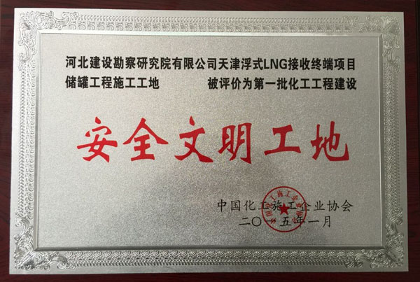 近日,我公司天津浮式LNG接收终端项目储罐工程施工工地被中国化工施工企业协会评为安全文明工地。