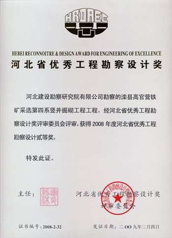 滦县高官营铁矿采选第四采竖井掘砌工程获河北省优秀工程勘察设计二等奖。