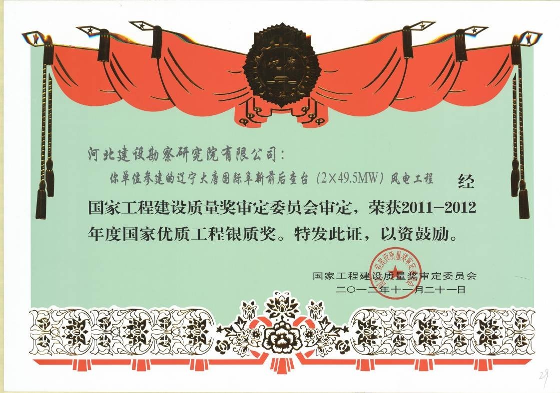 由我公司参与施工的辽宁大唐国际阜新前后查台(2×49.5MW)风电工程被国家工程建设质量奖评定委员会评定为2011-2012年度“国家优质工程银质奖”。