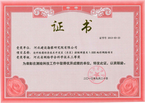 近日,由工程测量公司完成的沧州临港经济技术开发区(东区)控制测量及1:500地形测绘项目,被河北省测绘学会评为河北省测绘学会科学技术三等奖。